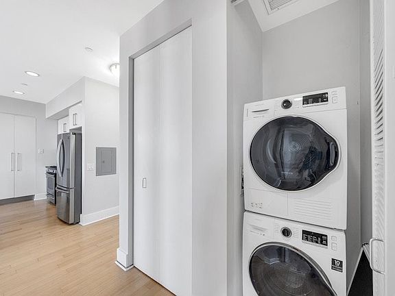 Hardwood floorsModern style bathroomOversized windowsSleek black stone countertopsWasher and dryerOpen city viewsStainless steel appliances
