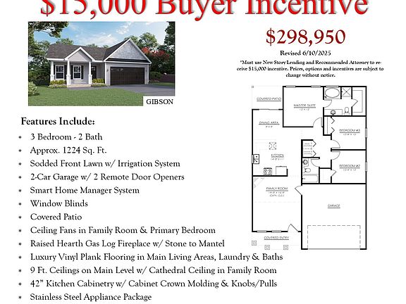 $15,000 Buyer Incentive Offered with Recommended Lender. NEW Gibson plan under construction in Briargate. 3 Bedroom - 2 Bath, Approx. 1224 Sq. Ft. Community Swimming Pool - Sodded Front Lawn w/ Irrigation System - 2-Car Garage w/ 2 Remote Door Openers - Smart Home Manager System - Window Blinds - Covered Patio - Ceiling Fans in Family Room & Primary Bedroom - Raised Hearth Gas Log Fireplace w/ Stone to Mantel - Luxury Vinyl Plank Flooring in Main Living Areas, Laundry & Baths - 9 Ft. Ceilings on Main Level w/ Cathedral Ceiling in Family Room. Kitchen Features 42" Cabinetry w/ Cabinet Crown Molding & Knobs/Pulls, Stainless Steel Appliance Package & Granite Countertops. Quartz Vanities in All Baths - Double Sinks, Garden Tub & Separate Shower in Primary Bath. 1+8 Builder Warranty Included.