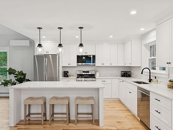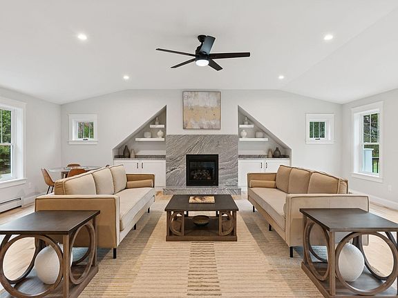 Coastal elegance meets modern comfort in this newly constructed 2025 Cape-styled home, quietly poised along Dunegrass's 16th hole - close enough for verdant views, thoughtfully set back for privacy. Sunlight moves across continuous wood flooring and crisp millwork, drawing you into an airy plan anchored by a sophisticated kitchen with stainless appliances and gas range, veined quartz countertops, a generous center island beneath glass pendants, and white Shaker cabinetry paired with matte-black hardware. The adjacent dining area flows to a vaulted living room where a sculptural gas fireplace and sliders open to the rear deck - perfect for morning coffee or golden-hour sunsets. The main-level private suite is a serene retreat with a fully fitted walk-in closet (custom shelving and matte-black hanging systems) and a spa-like bath with a glass-enclosed tiled shower, niche, and a double vanity. A discreet powder room, laundry with hookups, and storage-minded closets complete the level, while an open wood-tread staircase elevates the second-level arrival experience. Upstairs, two generous bedrooms with built-in walk-in closet systems share a polished full bath finished with tile flooring and quartz counters. Above the garage, a sprawling bonus room delivers true flexibility with bespoke built-ins, a second gas fireplace, its own rear deck, and a fitted walk-in closet - an inspired option for an additional upstairs primary, media lounge, or studio. Comfort is effortless with five mini-splits (all bedrooms, living room, and bonus room) complemented by a high-efficiency Viessmann boiler. Additional amenities include an attached two-car garage, an unfinished full basement, irrigation, and low-maintenance exterior selections. A polished, turnkey offering in a coveted golf-course setting - crafted for everyday ease and elevated Maine living. Minutes to the beaches, clubhouse, downtown Old Orchard Beach, I-95, restaurants, scenic trails, and OOB's Downeaster train to Boston!