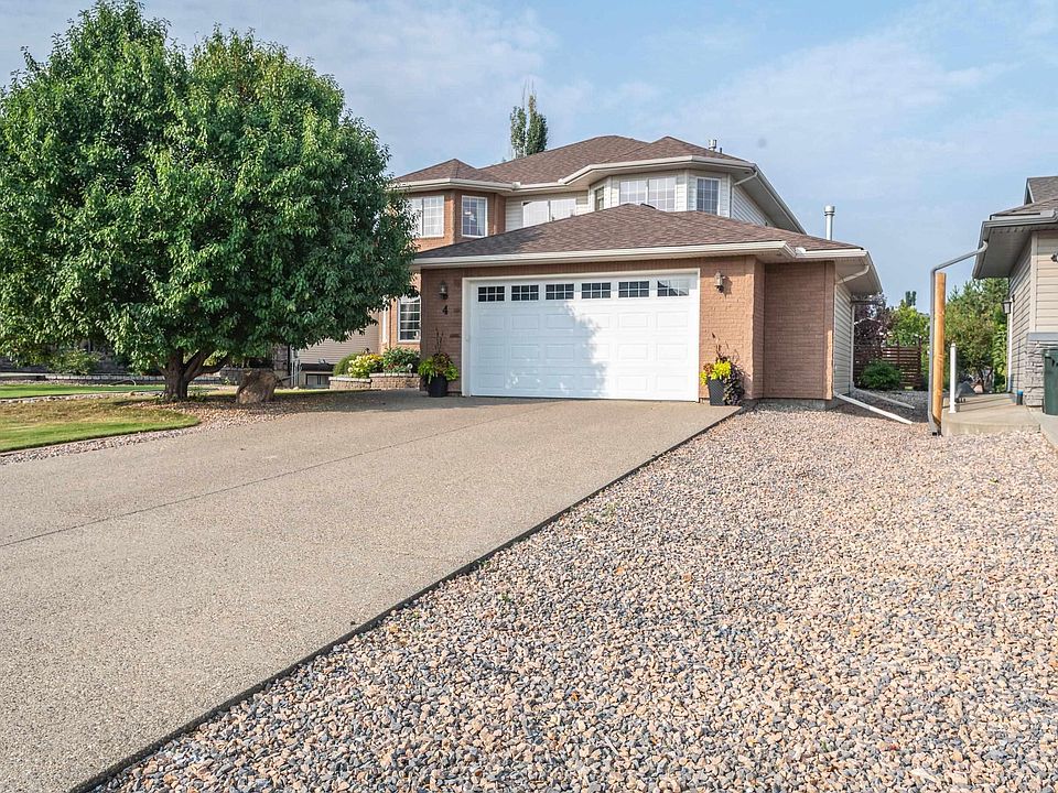 Welcome to Homes & garden show stopper! This 4 bedroom, 4 bathroom executive home with over sized double attached garage & double detached heated garage situated on a rare 1/3 acre lot designed for both comfort & entertaining. The open concept main floor features a chefs kitchen with an abundance of cabinetry, a large island, & dining area with oversized living rm area with gas fireplace. Main floor laundry & front den. Upstairs you can retreat to a king sized primary suite with its own fireplace, W/I closet, & 4 pc ensuite, along with two additional spacious bedrooms. The fully finished basement has a 4th bdrm along with large family rm with loads of room for family gathering. The true showstopper is the spectacular outdoor oasis professionally landscaped with underground sprinklers, stone paths, accent lighting, firepit, hot tub, and expansive covering deck centered around a breathtaking waterfall that has a private pond. Loads of room for extra parking completes this exceptional property. A RARE GEM!
