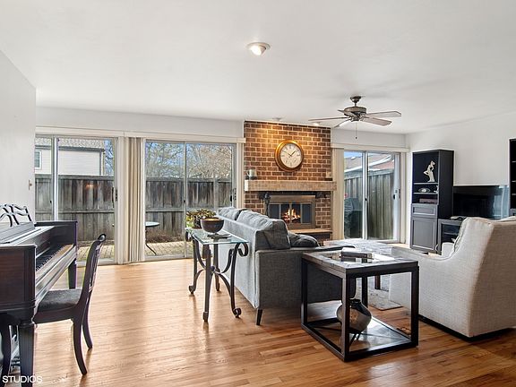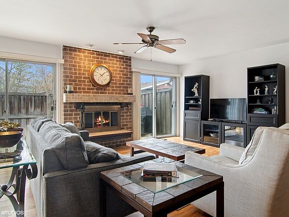 Welcome to your dream ranch townhome, where convenience meets comfort in a thoughtfully designed one-level living space. As you approach, you'll be greeted by a private front patio that invites visitors to your home. Step inside and discover a spacious living room featuring abundant sliding doors that bathe the space in natural light. The warmth of the brick wood-burning fireplace and the elegance of hardwood floors create an inviting atmosphere, enhanced by the open concept layout perfect for entertaining family and friends. For more formal gatherings, the dining room area offers a lovely setting. The kitchen is a chef's delight with ample white cabinets and generous counter space. An eat-in area provides a spot for casual meals. The additional sliding doors lead directly to your private, fenced-in brick paver patio-ideal for enjoying those beautiful warmer months. Retreat to your tranquil primary suite, complete with a charming window seat and plenty of closet space, along with a primary bath featuring a separate shower room for added privacy. An additional bedroom and full bathroom are perfect for guests or family, ensuring comfort for everyone. Need a workspace? The dedicated office with built-in organization provides the ideal environment for productivity, complemented by a separate laundry room conveniently located off the attached two-car garage. Recent updates, including a new furnace in 2023, provide peace of mind as you settle into your new home. Embrace the vibrant lifestyle of Fairfax Village, where you can enjoy a walkable community along with easy access to Route 53 and all that Schaumburg has to offer-from Woodfield Mall to a abundance of dining options and shopping.