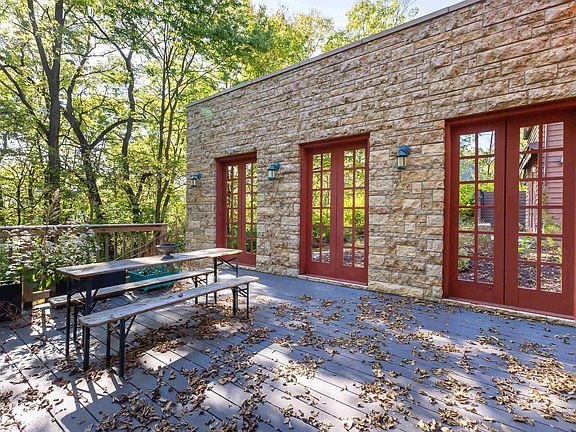 Welcome to a truly exceptional architectural retreat, thoughtfully designed around a stunning 132-foot-long, 13-foot-high limestone wall that anchors the home with timeless beauty and visual impact. This Frank Lloyd Wright-inspired residence is a harmonious blend of nature, light, and design, offering a warm and modern living experience on 2.10 private acres. Sunlight pours in through expansive windows that frame the open-concept main living area, featuring dramatic vaulted ceilings and a floor-to-ceiling stone fireplace that creates an inviting focal point. The seamless flow continues into the dining area and kitchen, which open onto a tranquil three-season porch — perfect for morning coffee or evening relaxation. Above the serene primary suite, you'll find a unique Tower Room with its own private deck — ideal for a studio, meditation space, or scenic retreat. The primary bedroom opens to a private patio complete with an outdoor shower and a hookup ready for your future hot tub oasis. The lower level features a spacious family room with radiant in-floor heating, a wet bar with refrigerator, and a cozy twin-sized window seat nestled in the stairway landing — a perfect reading nook. Japanese-inspired sliding screens offer flexible privacy to a fourth sleeping area or home office with its own gas fireplace, both spaces opening to decks that wrap around and connect to the main-level deck for easy indoor-outdoor living. Radiant in-floor heating in the lower level, primary bedroom and bath, and main-floor laundry Two-story, 5-stall heated/cooled garage with two utility sinks Garden shed and two extra storage areas Solar panels (2023), natural gas connection (2021), Trex Decks, and a newer roof (2015) Home Warranty included for peace of mind This home is more than a residence — it’s a work of art designed for comfort, creativity, and connection to nature.