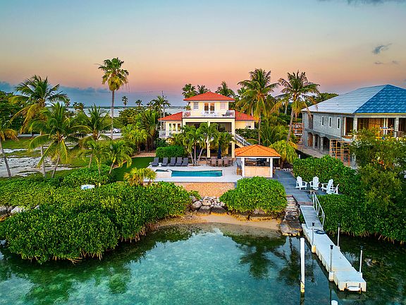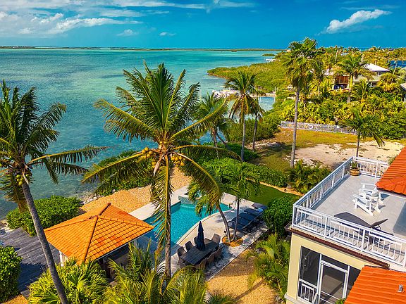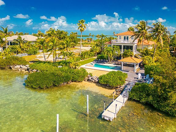 Experience classic island living in this 3BDR/3.5BA Shark Key waterfront residence. The generously proportioned main level allows for easy entertaining. An open floor plan with a fully applianced chefs' kitchen/great room is extended by the screened porch where you are surrounded by panoramic natural beauty and unparalleled sunset views. The formal dining room and entertainment quarter completes the modern interior. Two perfectly scaled, en- suite guest bedrooms offer privacy and sun- filled views. The master suite, with a vaulted ceiling and oversized private terrace, is exclusively located on the second floor. A warm natural color palette is accentuated by the bamboo flooring. A heated/chilled pool with private spa, tiki hut bar, floating dock, kayaks, garage and a carport are just a few of the additional amenities this exquisite island home has to offer. The private Shark Key community features a security gate, club house, lagoon and tennis courts among the meticulously kept grounds.