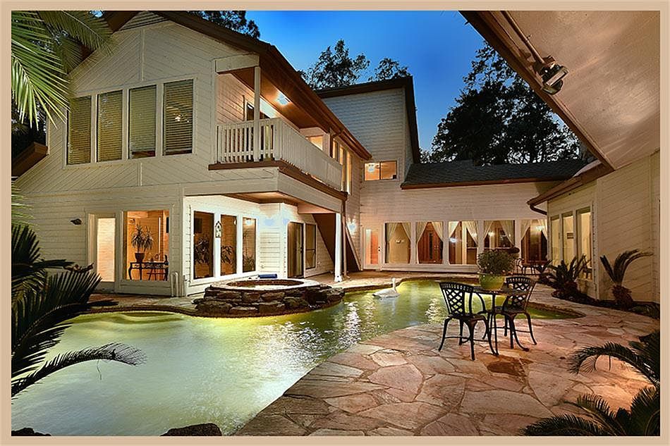 Beautifully unique custom on 1/2 acre lot in Grogan's Mill! Views of backyard oasis from almost every room! New A/C & water heater, int/ext paint-2015 & new roof-2012! Tile & parquet flrs & built-ins thruout; both formals share stone FP; wet bar; Island kitch & bkfst rm flow into oak paneled den w/FP; private sauna; mstr retreat dwn w/office & adjoining flex rm w/bath-perfect for nursery or exercise rm! 3 bdrms, 2 full baths & gamerm w/cvred balcony up; private yard w/pool, spa & rock waterfall!
