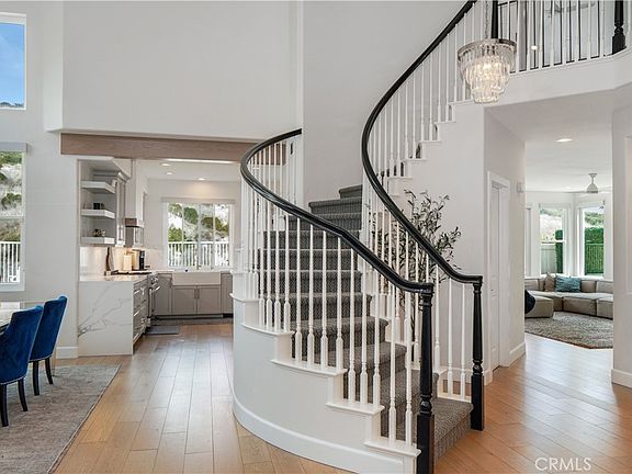 Private doesn't begin to describe this rare 5 bedroom-end of the peninsula cul-de-sac-pool home. 4 Celonova Place, Foothill Ranch exceeds expectations not only with its superior location but also with its freshly and fully remodeled interior. The meticulously developed exterior has been renovated and the lot offers amazing canyon views. With nearly 2900 square feet of living space and a 3-car garage, this home has room for everyone. From the moment you step through the double front doors you are greeted with an open and airy feeling of just being at home. The grand entrance opens into a bright and spacious living room with soaring 2-story ceilings that seamlessly connect through the living room into the formal dining area. The family room has a relaxing and cozy ambiance accentuated by a fireplace and flows perfectly into the remodeled family style kitchen where you will find a beautifully appointed chef’s kitchen with high-end finishes and dramatic lighting that really sets the mood. Stainless Steel appliances, a very large pantry and an absolutely stunning view of the pool overlooking the hills round out the amenities. The Main Floor Bedroom and bath is perfect for out of town and extended stay guests. The stunningly eye-catching spiral staircase leads to the 4 upstairs rooms. The Primary Bedroom brings the outdoors in and leads you to your very own private outdoor balcony where you can unwind and enjoy a peaceful morning, or gaze at the stars after a long day. Truly relax in the ensuite with spa like features and finishes that satisfy every sense. You will never be cramped for space with his and hers large walk-in closets and dual vanities. OUTSIDE, the home is set back on a single loaded street with a 3-car driveway. The backyard is an absolute oasis and is the perfect setting for outdoor gatherings. "By Day" you can bask in the California sun while soaking in the soothing salt water pool and "By Night" relax in the spa. The outdoor living space is true California Living with a fully equipped Bar and BBQ. The large patio is covered for outdoor gaming and turf grass surrounds the patio and pool area to keep maintenance to a minimum. You will also have access to the HOA amenities that include a pool, spa, sports court and picnic areas. Just minutes from world-class shopping, dining and Blue Ribbon schools which are Foothill Ranch, Santa Margarita Middle, and Trabuco High, this home has something for everyone.