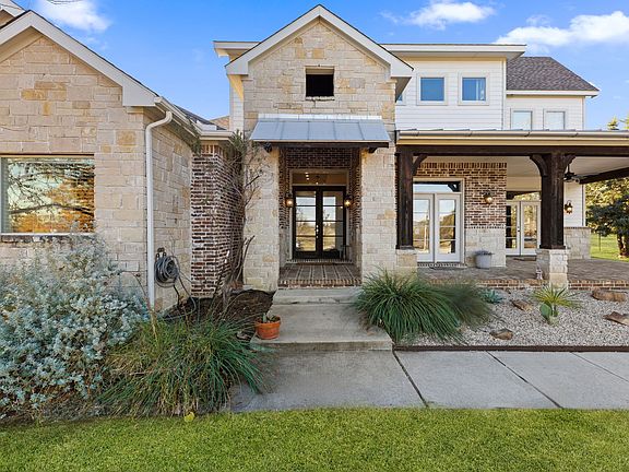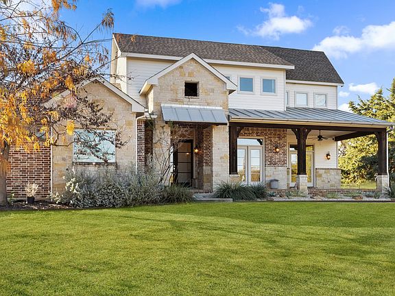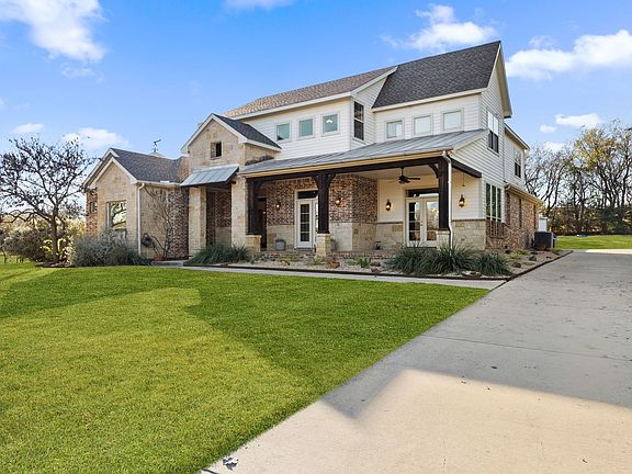 Situated on just under three acres in the heart of Lucas, this custom home offers privacy, functionality, and thoughtful design throughout, tucked away on a quiet cul-de-sac in highly sought-after Lovejoy ISD. A long driveway leads to a striking stone and brick exterior with a welcoming front porch, while inside the layout flows effortlessly for both everyday living and entertaining. Hand-scraped hardwood floors run throughout the main living areas on the first floor, setting a warm and timeless tone. The family room is anchored by a stone wood-burning fireplace and offers expansive views of the pasture and barn, opening to a large covered patio with gas stub for outdoor entertaining. The kitchen provides abundant storage with a five-burner gas cooktop, island seating, and a walk-in pantry with pull-out shelving, while the sunny breakfast room features French doors leading to the oversized covered front porch—an ideal space to unwind. The privately located primary suite overlooks the pasture and includes a large walk-in closet, separate shower, and garden tub. A secondary living area offers flexible use and includes a wet bar with sink and refrigerator, ideal for entertaining or everyday living. Upstairs, a spacious game room is joined by three generously sized bedrooms with walk-in closets, two sharing a bath and one with an ensuite bath. Additional highlights include a side-entry three-car garage with epoxy flooring, a 21x10 workshop with attic storage, 220-amp plug for a welder, and double doors for easy access, all surrounded by open, fenced land with no HOA restrictions.