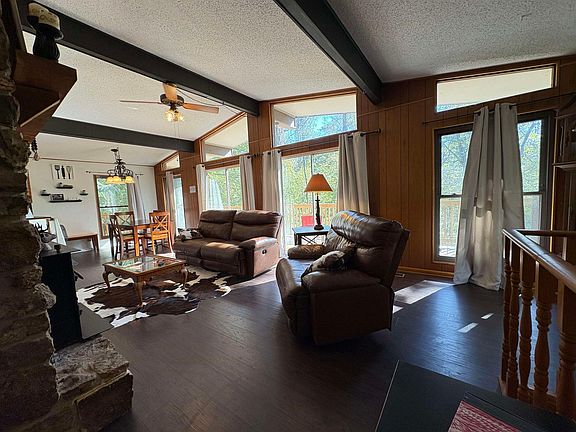 Discover your Ozark escape—where investment meets lifestyle. This 3-bed, 2-bath, 2,048 sqft Holiday-style home sits on a dead-end street just a short walk to the South Fork River. Every inch has been thoughtfully upgraded: stainless appliances, whole-house water filtration, new flooring, brand-new deck, and a fully remodeled walk-out basement transformed into a private suite. Downstairs features a spacious bedroom, living area, spa-inspired bath with walk-in shower + soaking tub, and laundry. Upstairs on the main floor, the open-flow kitchen and living room with vaulted ceilings & big bay windows keep the signature Holiday charm alive, with 2 bedrooms and a full bath down the hall. Step outside to relax on the deck or around the backyard fire pit surrounded by trees. Sold fully furnished—everything stays, from décor to washer and dryer—this turnkey Airbnb is ready to keep generating income or become your personal retreat. Enjoy access to seven lakes, two rivers, and the nearby North Golf Course—welcome to your next investment in the Ozarks!