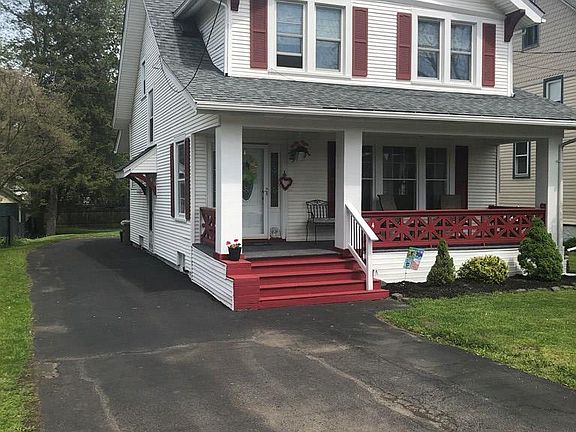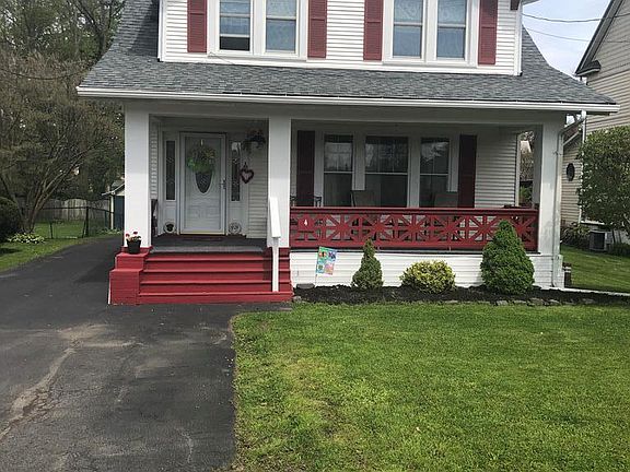 From the covered front porch to the open composite deck overlooking a large back yard, you will find yourself feeling right at home! Featuring a large living room with a gas insert and crown moulding. Newer kitchen (with office area) open to the dining room, and a first floor half bath. Upstairs has replacement windows and an updated full bath, fantastic closet and storage space, and a walk-up attic. Basement area could be made into a play cave for any age. Vinyl Siding, a New Furnace, New Roof and Central Air. Come take a look and make this house your home today!