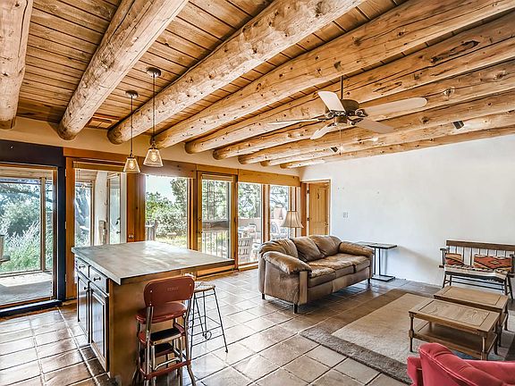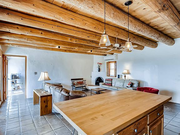 This cozy Rational Alternative built home was lovingly cared for by its one owner. It is conveniently located just off the paved road and sited to take in wonderful views to the south. Recently updated with ductless AC it is comfortable year round. The two bedrooms are at opposite ends of the house and each has its own door to the peaceful and bucolic courtyard which is graced by several large trees and an outside fireplace. The floors appear to be concrete tile. This is an efficient and easy house to understand and appreciate.