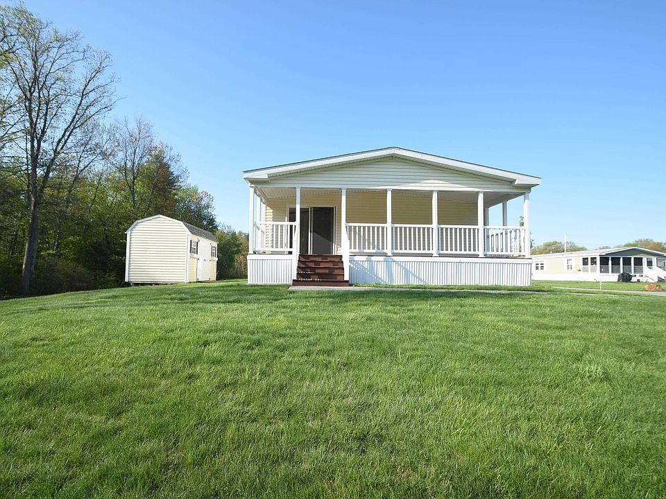 This well-kept 2-bedroom, 2-bath home offers an open-concept layout with new rugs, private lot, oversized covered porch, paved driveway with 2 parking spots and great size shed. Clean, welcoming, and ready for a quick close. Located in an age-restricted community. No dogs are allowed, but cats are welcome. Park approval required. This is not your average mobile home park. The homes are situated on 78 acres with neighborhood streets surrounded by mature landscaping, trees, and a 3-acre pond. There is a wonderful recreation hall complete with a library, pool table, and a full kitchen. Move in by summer and enjoy the heated pool and fishing.