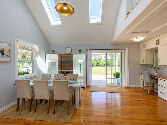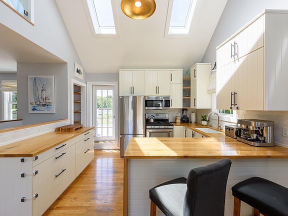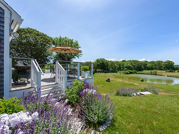 Welcome to your pond front oasis at 4 Elisha Lane. This contemporary cape style two-bed, two full bath home offers a serene retreat atop 1.38 acres in central Oak Bluffs. The open-plan layout features cathedral ceilings, skylights, and abundant natural light. The first floor seamlessly transitions from the kitchen with stainless appliances to the living lounge, dining, full bathroom, and office alcove. Step onto the elevated rear deck for outdoor living and dining, overlooking the lush yard and freshwater pond. The primary suite opens to a private covered bluestone patio. A spacious guest bedroom shares a full bathroom with linen and laundry. The finished loft and renovated detached structure provide additional living options. Hydrangea lined driveway, perennial flower and herb gardens surround a custom child's play structure. Privately situated yet easily accessible to town, bike paths, and transit, this location is ideal. With a strong rental history, this property is fully turnkey.