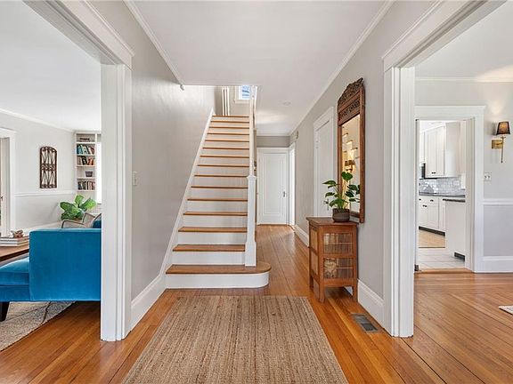 This is the one you have been waiting for. Step through the door of this very special three story Dutch Colonial and enjoy 8.5 foot ceilings, countless architectural details, lovely hardwood floors and large, light-filled spaces. The first floor features generous reception and living spaces, including a living room with built-in bookshelves, an inviting fireplace and just beyond a gracious family room with a coffered ceiling, window seats and french doors that lead to a bluestone terrace and fireplace. A large well-appointed dining room with bay window, flows into the eat-in kitchen with granite counters and a sun-filled breakfast area, and leads to a mudroom with plenty of storage and space. The second floor boasts an ensuite primary bedroom with built-ins, walk-in closet and a renovated bath featuring quartz countertops and radiant heated floors.Three additional large bedrooms and a full bath complete the second floor, while the third floor provides extra space for an office, playroom, or guest room. The basement is partially finished with laundry, storage and space for additional recreation space. An upgraded heating system, including a central heat pump and electric hybrid hot water heater combine beauty with efficiency. Enjoy a short commute to Providence, with trains to Boston and New York, and with top-rated Barrington schools and the East Bay Bike Path all within walking distance. Not to be missed!