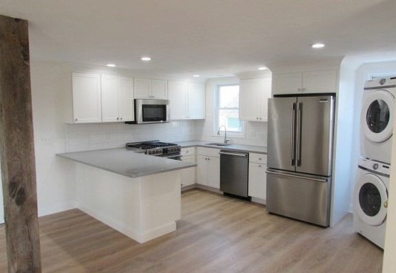 LIKE NEW! Completely redone second floor unit. Total of 13 windows let in lots of natural light to show off all the new features: New cabinets, flooring, bathroom, paint and appliances. Central air and Natural Gas heat. Granite counters, tile backsplash, new dishwasher, refrigerator, washer and dryer in unit. Two big bedrooms and a beautiful tile shower in the new bath. Front unheated room can be used for storage and there is a separate unsecured storage area in basement. Open concept living only a few miles to Crane Beach, Castle Hill, and walking distance to downtown which offers terrific restaurants, the Riverwalk and a host of great local events. Just a few steps to the MBTA Commuter Rail stop as well. Great opporutnity to live in a like-new unit in the heart of Ipswich.
