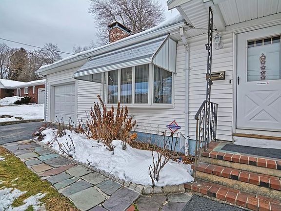 This home is not a drive-by, its very deceiving from the dead end street.Very well maintained custom ranch, with solid bones. Garage has plenty of storage with pull down attic stairs for addt'l storage and screens for the garage door for summer days.Oversized central air unit. Entryway has travertine tile, which flows nicely into the large living room. Living room has custom bookcase, brick hearth fireplace with a pellet stove,and a 5 panel bay window. Honey maple hardwood floors in living room, hallway and all bedrooms. Large eat in kitchen with granite, updated stainless steel appliances,under mount Italian beveled stainless dual sink with motion sensor faucet and professional grade garbage disposal. The 1st floor bath has updated granite, 17" dual flush Toto toilet and jetted tub. Maple H/W stairs to the semi-finished basement. Which includes another fireplace, canning closet,cedar closet.Upgraded windows, gas furnace,new HW tank,blown-in insulation makes this house cost efficient