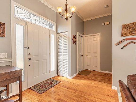 Tucked away in the highly sought-after Whispering Oaks community, this beautifully maintained 3BR/2BA split floor plan pool home offers both charm and convenience. Nestled on a quiet cul-de-sac in the heart of Ormond Beach, this hidden gem is surrounded by other well-kept homes, creating a peaceful and private setting that many don't even know exists. Step inside to a spacious master retreat with Jacuzzi tub, large walk-in shower, convenient laundry chute and an oversized walk-in closet. The living area features elegant crown molding and a cozy wood-burning fireplace, while the open kitchen offers a built-in pantry, pocket door, and seamless flow to the dining room. The inside laundry is designed with function in mind, complete with a folding table/ironing station, wash sink, and washer/dryer included. One guest bedroom includes a walk-in closet and a Murphy bed, making it the perfect flex space for an office or guest room. The extra-large 2-car garage boasts two separate garage doors a side entry door and refrigerator, offering plenty of room for storage and hobbies. Outside, enjoy a brick-faced exterior, fully fenced yard, and a screen-enclosed pool, perfect for entertaining or unwinding in your own private oasis. Major updates include a new roof (2022), water heater (2022) and AC (2013). For added peace of mind, a home warranty is included. Don't miss the chance to own this rare find in one of Ormond's best-kept secret neighborhoods!