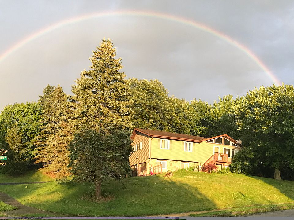 Great location. Great school district. Beautiful sunset views from wall of windows in living room. Deck is great for hosting barbecues, and very private with mature trees in backyard. Bus stop for schools is right in front of house. Upstairs: Living room with fireplace, DR, kitchen (with sliding doors to deck), hallway, full bath, and three bedrooms (master bedroom has walk in closet and additional 3/4 bathroom). Downstairs: Washer/dryer, large family room with wood burning stove, guest bedroom with 1/2 bath, and office. Attached oversized two car garage. Large shed in back. Attic has plenty of storage. Front door borders Cunningham Rd., driveway is off of Forge Rd. Sidewalks on both sides. Quiet neighborhood, great neighbors. ** UPDATE ** ALL CARPETING HAS BEEN REPLACED WITH HARDWOOD FLOORING - KITCHEN COUNTERS HAVE BEEN REPLACED WITH GRANITE - UGLY YELLOW BATHROOM HAS BEEN PARTIALLY REMODELED. Will upload new pictures shortly!