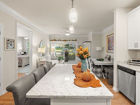 Welcome to Riverside Woods, a desirable 62+ community offering comfortable and convenient living. This beautifully appointed first-floor unit features 1 bedroom plus a versatile den—ideal for a guest room or home office. Thoughtful upgrades include quartz countertops, stainless steel appliances, a center island for casual dining, crown molding, custom closet organizers, and elegant plantation shutters in the bedroom. French doors lead to the den, while a slider opens to a private, south-facing patio perfect for morning coffee or quiet relaxation. Additional highlights include a garage parking space under the building, ample outdoor common parking, clubhouse with gym and direct access to scenic walking trails. A rare opportunity to enjoy low-maintenance, one-level living in a vibrant, well-maintained community.