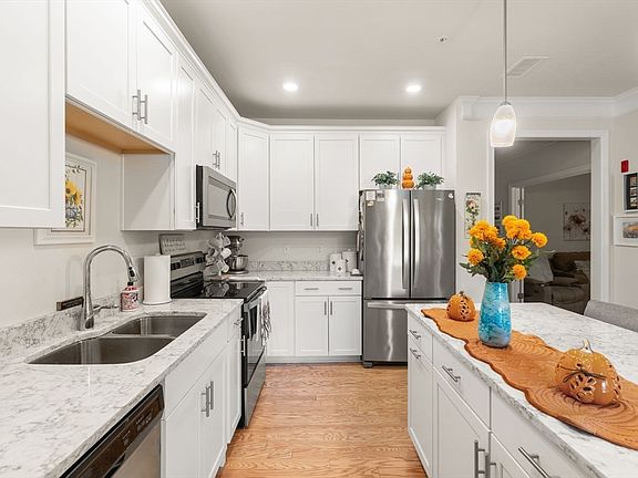 Quartz countertopsPrivate south-facing patioStainless steel appliancesFrench doorsCrown moldingCustom closet organizersElegant plantation shutters