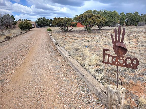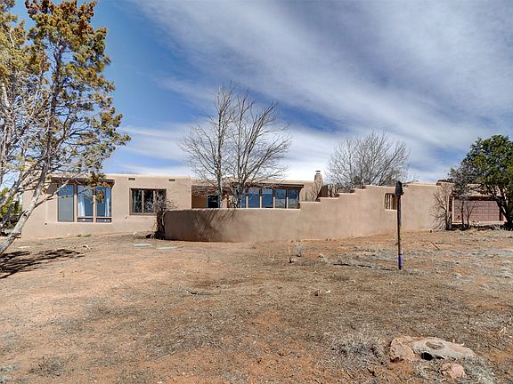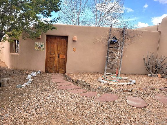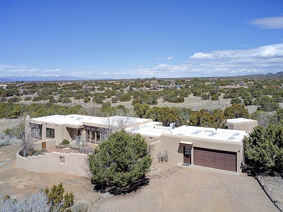 This highly desirable Eldorado, passive-solar home is on a quiet road bordering a greenbelt. The open floor plan includes numerous skylights, brick, and saltillo tile floors, plus beamed ceilings. The kitchen has generous counter space, two pantries, and oak cabinets with pull-out shelving in the lower cabinets. The living room has a wood-burning kiva and tall windows with views of the front courtyard and the surrounding mountains. Double doors lead to a large multi-purpose, saltillo-tiled family room, laundry, and a third bath with a large soaking tub. The three bedrooms have large closets. The primary bedroom has a romantic wood-burning kiva fireplace, an updated bathroom with double sinks, and an oversized shower. Mini-splits are in the kitchen/dining, family room, and primary bedroom. Electric hydronic (water) baseboard heat with two Trombe walls and a gas stove in the family room provide warmth in the winter. There is a large flagstone entry courtyard and an enclosed yard off the primary bedroom. The well-treed backyard has a heated studio, a large brick patio with mountain views, and an inviting ramada overlooking the greenbelt. Eight rain barrels convey. There are two steps down to enter the primary bedroom and two steps up to enter the garage.