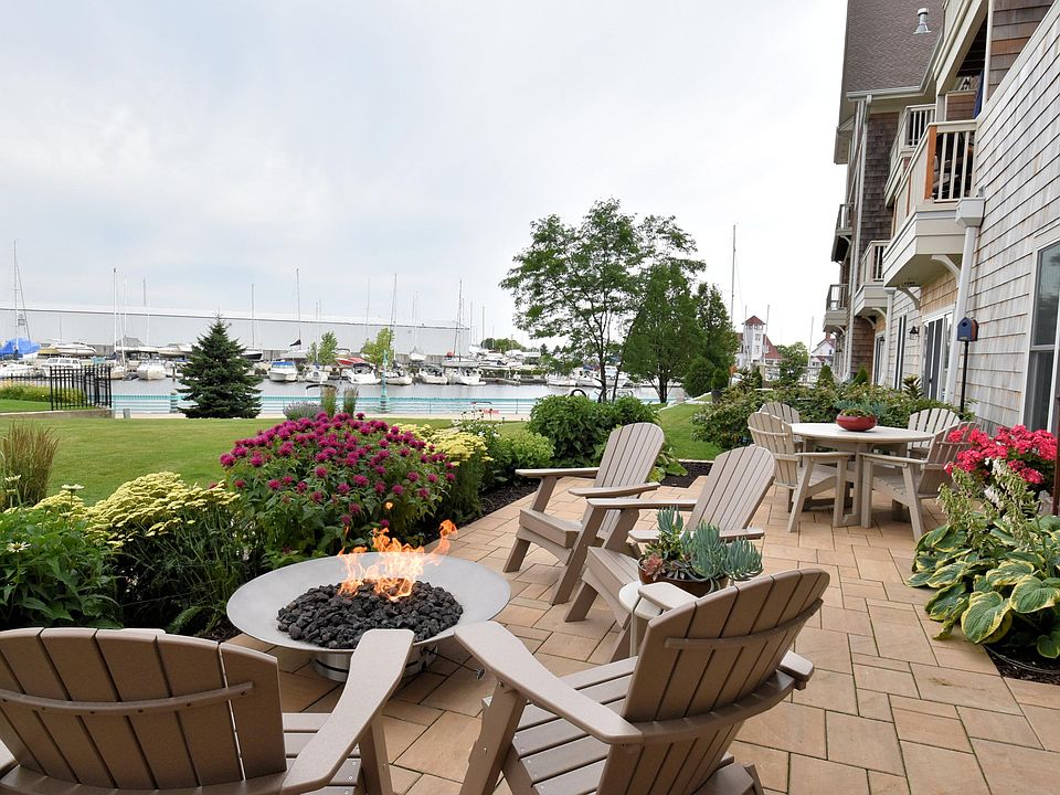 Seller has pointed remodeling to this beautifully updated ranch-style condo on Lake Michigan adjacent to Reefpoint Marina! Updates include kitchen granite CT, sink, backsplash, SS Appliances w/ eat-in kitchen, LED cabinet lighting and light fixtures, carpeting in BR & Den, furnace (Lennox 2019), full size in-unit washer/dryer & power shade window treatments plus white folding doors. Open sliding glass doors lead onto newly installed stone patio by Mileagers where family & friends celebrate July 4th fireworks or parade of boats on Venetian Night! , Plus patio boasts gas firepit connected to house supply gas line, plants and flowers w/ an inground sprinkling system! Upgrades totaling over $40K in this move-in ready waterfront condo!