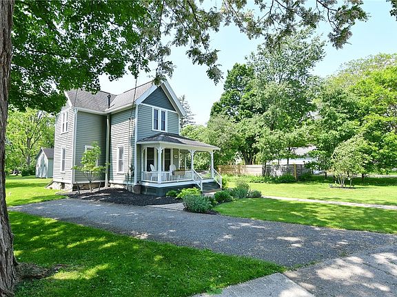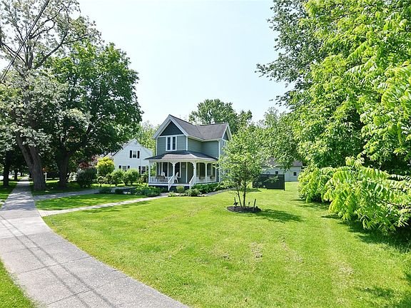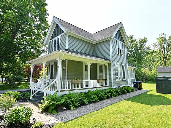 Step into comfortable elegance with this quaint Victorian home, where classic charm meets thoughtful updates. Nestled on a beautifully landscaped lot of more than a half of an acre in the village of Geneseo, this lovingly maintained house boasts award-winning gardens that offer a storybook setting. Start or end your day on the new wrap around front porch. Inside you'll find original woodwork, tall ceilings and vintage details. The first floor den makes a perfect home office, library, or cozy retreat. The heart of the home is the updated, bright kitchen where modern function meets historic style. Island w/ breakfast bar, ample cabinet & counter space, recessed lighting, modern appliances, & additional storage in the enclosed side porch. Cute half bath with pedestal sink, formal dining room, & bright living room complete the first floor. New flooring in the primary bedroom, which adjoins dressing room, nursery or 3rd bedroom. Guest bedroom has large closet. Spacious bathroom with tub and separate shower, ceramic floor, & large vanity with double sinks. Detached original barn with lots of potential. Walking distance to village shops, restaurants and SUNY Geneseo.