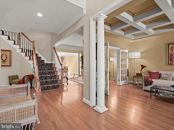 Introducing this spectacular home in the sought-after gated Rockland Ridge community, featuring four bedrooms and three-and-a-half bathrooms. Spanning three levels of exquisite living space, this home offers room for everyone. A grand two-story foyer makes an unforgettable first impression, leading to light-filled interiors with oversized windows and soaring ceilings. Hardwood floors and elegant crown molding extend across the main and upper levels, while ceiling speakers and recessed lighting enhance the ambiance on the main and lower levels. Stately columns define the living room, where a sophisticated coffered ceiling and plantation shutters add character. French doors open to an inviting sitting room, perfect for lounging or entertaining. A tray ceiling with crown molding continues seamlessly into the spacious dining room, ready to accommodate gatherings of any size. Designed for both function and style, the gourmet kitchen boasts granite countertops, a tile backsplash, and a massive center island with seating for six. 42” cabinets with underlighting and wine storage provide ample space, while stainless steel appliances include a five-burner gas cooktop and double wall oven. The adjacent family room centers around a cozy gas fireplace and offers access to a composite deck with a built-in gas line for grilling, all overlooking peaceful wooded views. Finishing the main level are a half bathroom, large laundry room with storage, and access to the two-car garage. Upstairs, the primary suite provides a serene escape with picturesque wooded views and an expansive walk-in closet featuring a custom organizing system. The luxurious en-suite bathroom includes a dual-sink vanity, jetted soaking tub, and glass-enclosed walk-in shower. Two additional bedrooms and a shared hall bathroom with a tub-shower combination complete this level. Downstairs, the finished lower level expands the home’s versatility with a spacious game room and an open recreation area offering walkout access to a covered patio and the yard that backs to trees. A fourth bedroom suite on this level includes a walk-in closet and private en-suite bathroom with a walk-in shower—perfect for guests or anyone seeking a private retreat. A large utility room provides ample storage. Located just off Falls Road, this home offers quick access to I-83, I-695, Greenspring Avenue, Old Court Road, and the Falls Road Light Rail station for effortless commuting. Minutes from shopping, dining, and entertainment, with outdoor recreation at nearby Lake Roland trails and Quarry Lake.