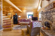 Dramatic stone fireplaceCustom log cabin retreatHand-hewn logsExposed beamsSpacious airy feel