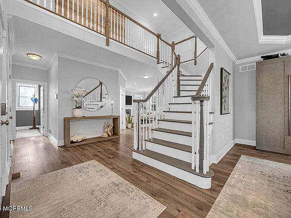 Discover the perfect blend of seaside serenity and city convenience! Just five minutes from Sandy Hook beaches and close to two ferries to Manhattan, this beautifully updated home features new LVP flooring, lighting, and paint. The gourmet kitchen boasts Miele appliances and a 6-burner cooktop, opening to a large deck with wooded views. Enjoy a flexible den/5th bedroom, a luxurious primary suite, and a fully finished basement with 9' ceilings, full bath, and media room. Association-maintained exteriors offer low-maintenance living near beaches, trails, and charming coastal towns.