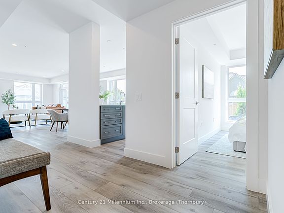 Welcome to Royal Windsor Condominiums in Beautiful Collingwood - This Brand new KNIGHT suite (1,500 Sq ft) has a two bedroom, two bathroom. 2 (tandem) assigned underground parking spaces and a storage locker are included with the purchase of this state of the art, condo with luxuriously appointed features and finishes throughout. Step into a modern, open-concept space filled with natural light, featuring luxury vinyl plank flooring, quartz countertops, smooth 9ft ceiling, soft-close cabinetry, and elegant pot lights throughout this spacious unit. Royal Windsor is an innovative vision founded on principles that celebrates life, nature, and holistic living. Every part of this vibrant community is designed for ease of life and to keep you healthy and active. Royal Windsor has a rooftop terrace with views of Blue Mountain - a perfect place to mingle with neighbours, have a BBQ or enjoy the party room located opposite the roof top terrace. Additionally, residents of Royal Windsor will have access to the amenities at Balmoral Village including a clubhouse, swimming pool, fitness studio, games room and more. It is worth a visit to the sales centre to tour this beautiful building. ALL HST is included in the price for buyers who qualify. Pictures include staged furnishings that have since been removed.