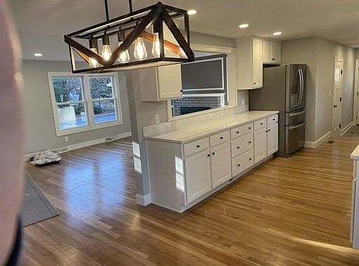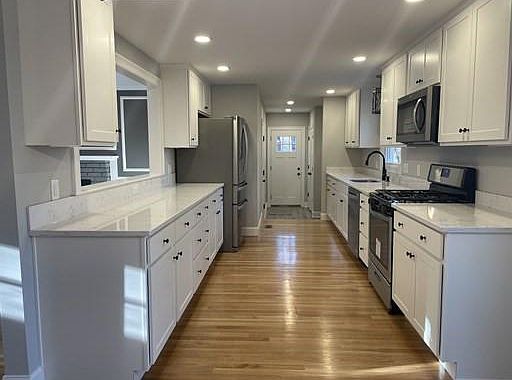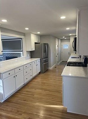 Completely remodeled ranch style home featuring 4 bedrooms, 2 baths, hardwood flooring, dining room with wainscoting, living room with recessed lights, gas fireplace, crown molding and wainscoting, kitchen with under cabinet lighting, stainless appliances and quartz countertops, finished basement featuring LVP flooring, family room with recessed lights and full bath with quartz countertops and tile surround tub/shower combo. Central a/c, pull-down attic,1 car garage, deck overlooking large level yard and much more! Great commuter location, close to major routes, shopping, etc.