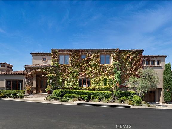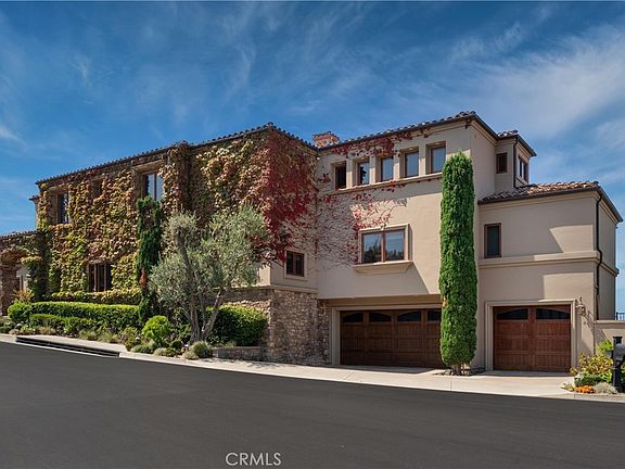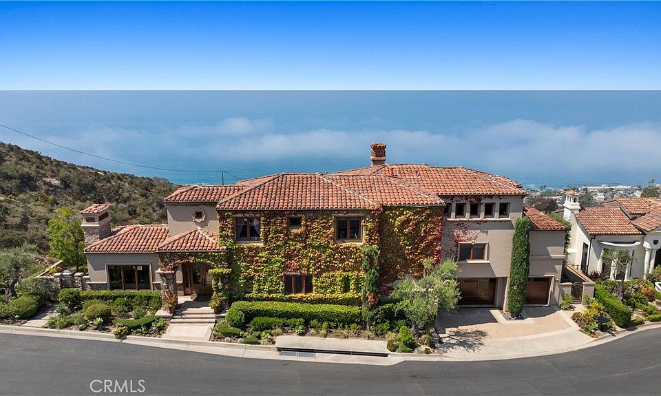 Nestled within a prestigious guard-gated community, this Mediterranean custom estate is perched on a scenic bluff, capturing sweeping, unobstructed views of the ocean, Catalina Island, and coastline from nearly every room. Thoughtfully designed with four bedrooms and a dedicated office, the residence features a sought-after main-level primary suite and ensuite baths in each bedroom, offering elevated comfort and privacy. Defined by timeless craftsmanship, the interiors blend rustic elegance with refined detail highlighted by custom distressed wood beams, rich hardwoods, stone accents, and bespoke lighting throughout. French doors open to expansive viewing decks, creating a seamless connection to the coastal surroundings and inviting in ocean breezes. Tailored for both intimate gatherings and grand entertaining, the home offers a formal living room with stone fireplace, a sophisticated dining room, and a spacious great room that flows effortlessly into the chef's kitchen. Culinary enthusiasts will appreciate the Thermador gas range with grill, double ovens, dual warming drawers, Sub-Zero refrigerator, and additional refrigerated drawers. A walk-in pantry, butler's pantry, wet bar, and temperature-controlled wine room complete the entertainer's experience. The outdoor living area offers a serene escape, enhanced by lush landscaping, a tranquil water feature, and a striking fireplace. This private retreat features the perfect backdrop for relaxed coastal living beneath the stars. All just moments from the renowned beaches, art galleries, and fine dining of Laguna Beach.