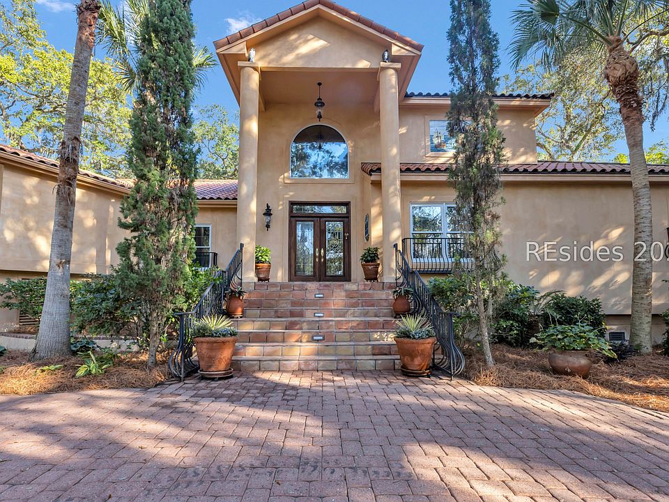 Heated poolCovered porchesMediterranean-inspired waterfront residenceBeautifully manicured groundsGourmet eat-in kitchenSpacious open floor planCircular paver drive