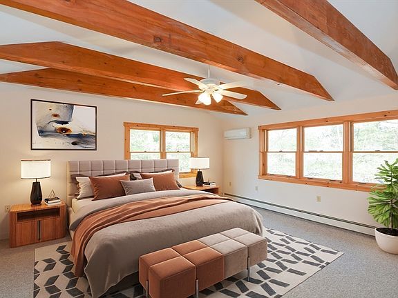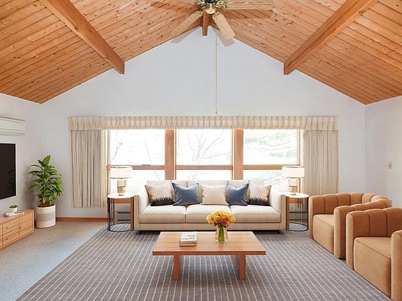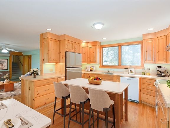 Amazing views of pond and BONUS 2 car detached garage with two rooms above perfect for home business or studio or hobby room. Contemporary style, private setting, beautiful quiet dead end street. Great space for this sprawling home, several walk-in closets, all season sunroom, open floor plan to make your own, loads of rooms, walls of windows designed to enhance your viewing pleasure of the lovely pond. Large eat-in kitchen opens to formal dining room with loads of built-ins, spacious gathering room all with gleaming hardwoods along with hardwood staircase. Several rooms have new carpets. Additional family room with cathedral and beams. Two and a half baths. Beautiful custom stone patio to enjoy the pond and all nature offers. Enjoy Kayaking, fishing, and peace of nature! A rare find! Bring offers!