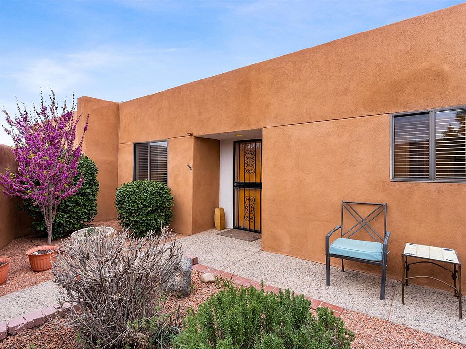 Don't miss the beautiful townhouse in La Luz Del Sol with expansive VIEWS! The majestic Sandia Mountains by day, the beautiful city lights twinkling at night. This desirable, quiet gated community offers a pool and is close to trails, shopping, restaurants and freeway. This well-maintained home features tongue and groove raised ceilings and brick floors throughout the living area and kitchen, complete w/ granite countertops. New tile has been added to the hall, primary suite, laundry room and guest bath. Living room offers a wood burning fireplace and picturesque window and access to the private back patio. Easy care landscaping in front and back patios with a 7ft wall in front and a 3ft wall in back.