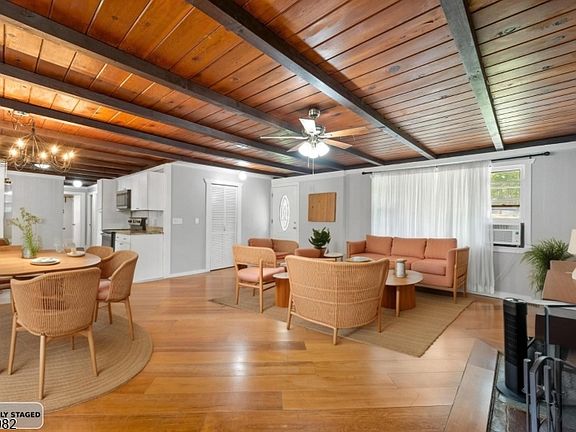 Welcome Home, be in before the Holidays! Lake-style ranch, no steps, rustic feel, beamed ceilings & peaceful retreat surrounded by nature just moments from the lake. Featuring 3 bedrooms and 1 bath, this move-in-ready home offers comfort and character throughout. Enjoy a cozy great room with wood-burning fireplace, beautiful ceilings, and a galley kitchen perfect for easy meal prep. The laundry room is conveniently located off the great room, with plumbing perfect for a second bath. Step outside to your deck, patio, and gardens, or relax on the front lawn by the fire pit. Two sheds and a fenced area (previously used to keep deer out of the garden) provide plenty of storage and outdoor versatility. Ideally located for outdoor adventures hike, bike, swim, fish, ski, or boat yet close to highways, shopping, restaurants, and spas for easy commuting and convenience. FP & chimney are being sold as is (no known issues).Come experience the tranquility and charm of lake living your perfect home retreat awaits! Motivated Sellers!