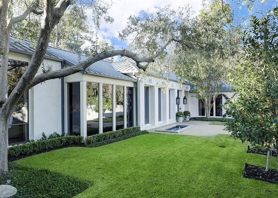 This striking Mid-Century Modern residence, which has been comprehensively renovated and elegantly enhanced to recapture its original style and timeless appeal, is located on an approx. 63,114 sq. ft. lot. Behind the walled courtyard, glass and steel doors open to to this fabulous 4 or 5 bedroom home. The double height entrance gallery leads to the dining room and into the kitchen which features an oversize 3-inch slab statuary marble top island. The open den with impressive fireplace and breakfast room make this a focal gathering place. The living room hosts floor-to-ceiling windows with views of the pool, spa and extensive grounds. The bar, den and study are located on the other wing. Secluded at the end of the gallery, the elegant master suite encompasses a marble-clad bath and pair of custom-fitted walk-in closets. The 2-story pool and guest house has a bedroom with bath and walk-in closet. The approx. 8,633 sq. ft. per HCAD includes the 7,093 sq. ft. main house and the approx. 1,540 sq. ft. pool/guest house.