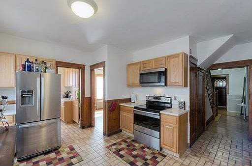 - Kit Dscrp: Pantry, Main Level, Cabinets - Upgraded, Flooring - Stone/Ceramic Tile, Countertops - Upgraded, Exterior Access, Country Kitchen, Wainscoting