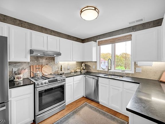 Open-concept living meets designer flair in this stunning end-unit at Mountain Ridge Townhomes! The beautifully updated kitchen features refreshed wood cabinetry, stainless steel appliances, and a custom center island that's perfect for entertaining. A stylish powder room with elevated finishes and a separate dining area overlook the sunken living room, complete with custom built-ins and sliding doors to your private deck. Step outside to enjoy scenic views, multi-tiered gardens, and peaceful privacy backing to state land. Hardwood floors flow throughout the first level and hallways, adding warmth and continuity. Upstairs, the spacious primary suite offers newer carpeting, three custom closets, and a full bath with double vanity and stall shower. The second bedroom includes fresh carpet, a large double closet, and access to a full hall bath with shower/tub combination. Stackable washer/dryer in hall round out the second floor. The finished basement, with wood-look tile, makes the perfect home office, gym, or rec room. An oversized garage off the basement provides space for a car, motorcycle, additional refrigerator, and abundant storage. Recent updates include bedroom carpet + window treatments (2025), garage door opener, belts, and remote (2025), kitchen refrigerator (2025), roof (2024), HVAC (2023), water heater (2021).