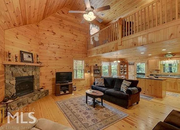 Perfectly Located and Just a step or 2 into the All Wood Interior Great Room of this Beautiful 3 Bedroom 3 Bath Mountain Cabin. Enjoy the Rock Fireplace, Soaring Cathedral Ceilings with Spacious Loft above. Bay Bump-out expands the Eat-in Kitchen with Island and All Appliances Remain. Master on Main with Giant Full Bath and Laundry accross the hall. Multi-Use Loft above connects with Spacious Upstairs Bedroom with Huge Full Bath On-Suite. Finished Basement has Rec Room with Second Rock Fireplace, Bedroom & Full Bath with Extra Deep Garage with Bar for that "Car Guy" and all the Toys. Full Width Screened Porch over Cement Patio offers tons of Outdoor Living Space. All Paved Roads and Resort Amenities: Pools, Parks, Fitness, Tennis, Fishing/Kayak!