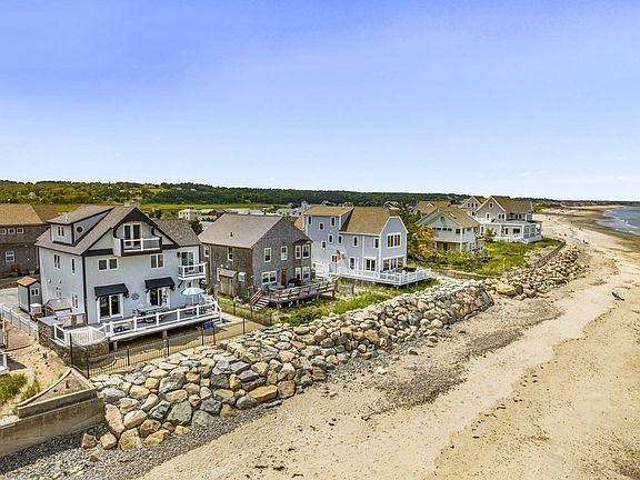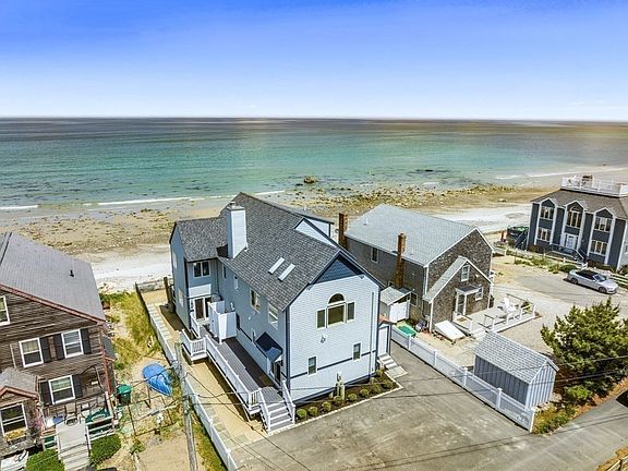 Stunning waterfront home on gorgeous Rexhame Beach, known for its picturesque coastline, spectacular sunrises and moonrises, and summertime celebrations! This beautiful home is majestically situated with direct, private access to the sandy beach below! Three floors of living, thoughtfully updated with an emphasis on detail and ease of living. The open concept 1st floor has a casual coastal elegance combined with a stylish beach vibe; white kitchen with quartz countertops and island, recessed, sconce and pendant lighting, and a beautiful gas fireplace. Walls of windows allow natural sunlight to spill into the living area and beckon you to the expansive deck and outdoor kitchen, the perfect spot for entertaining, where the amazing 180-degree view will take your breath away! Impeccably maintained, improvements include a new revetment wall, new roof, new heating system, new windows, new storm shutters, new mini-split unit, new outdoor shower and much more. The quintessential good life!