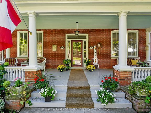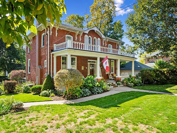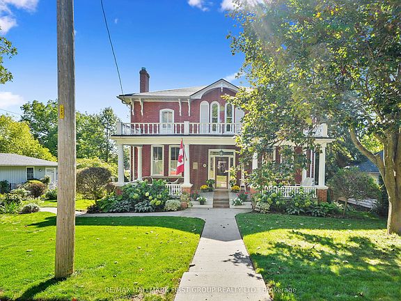 This character-filled two-storey red brick century home, circa 1860s, blends historic charm with generous living space and modern convenience. A covered front veranda, surrounded by meticulously maintained perennial gardens, sets the tone for the timeless elegance found throughout. Inside, the main floor showcases period details including extra-wide baseboards, detailed crown mouldings, and decorative ceiling coins. The sunlit front living room with fireplace flows seamlessly into the spacious formal dining room. A thoughtfully designed kitchen features a central island with pendant lighting and a vintage-inspired cooktop and oven, opening into an informal dining area. A bright family room with a walkout and bar area provides the perfect space for entertaining, complemented by a guest bathroom on this level. The upper floor is anchored by the primary suite, which features an en-suite bathroom and a walkout to a private balcony. Three additional bedrooms, a full bathroom with a separate tub and shower, plus a double vanity, and a cozy den or reading nook complete the layout. The lower level offers ample storage and a separate walkout to the backyard. Outdoors, discover a private retreat featuring a fully fenced yard, tranquil pond, screened wood gazebo, and spacious deck, perfect for alfresco dining. A detached four-car garage provides exceptional parking and storage. Located near schools, amenities, and offering easy access to Highway 2 and the 401, this historic gem is the perfect blend of character, comfort, and convenience.
