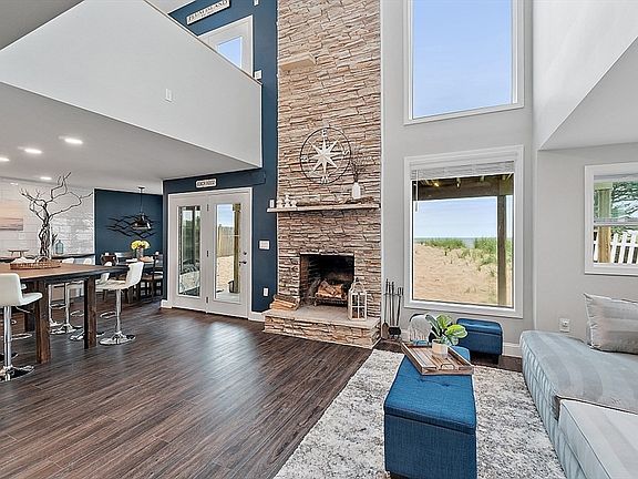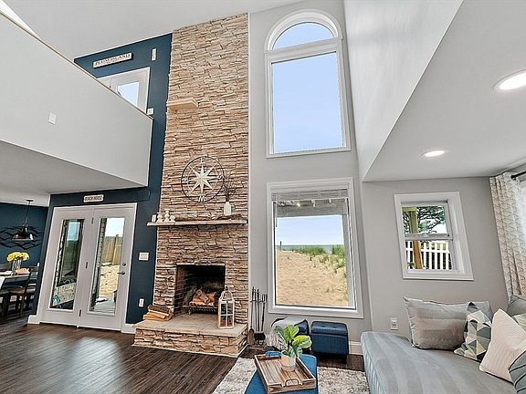 Oceanfront with a fireplace on Plum Island! Plus the local restaurants and businesses remain OPEN all year round. This home offers stunning views from generous windows that create a feeling that only living on the ocean can give you. The waves are a show on their own! A modern open design, newer furnishings and appliances, a soaring ceiling in the living room with a two story working stone fireplace. This house is being offered fully furnished from Nov - April. Ideally for 2-4 people, the monthly rent includes all utilities except oil. Enter at ground level, the mostly finished bunk room to the L and stairs to main level. On main lv you'll find an open Living room, Fireplace, Kitchen/dining, a King bedroom, Laundry room and full bathroom. Next level up is the Main King Bedroom with private top deck access, large full bathroom with soaker tub and oversized rain shower and the Great room with door to upper deck and halfwall overlooking lower living room.