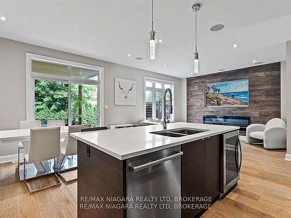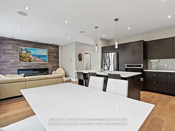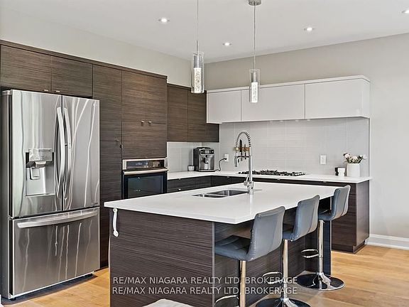 Welcome to this beautifully crafted home by Silvergate Homes, nestled in one of North End St. Catharines' most sought-after subdivisions. Ideally situated on a quiet, family-friendly street, you'll enjoy the convenience of nearby top-rated schools, scenic Port Dalhousie Beach, and the renowned Niagara-on-the-Lake wine country plus seamless access to the QEW for easy commuting. Offering a spacious and thoughtfully designed layout, this home features 3 bedrooms, 2 full bathrooms, and 2 additional powder rooms. The open-concept main living area is perfect for entertaining, enhanced by custom built-in ceiling speakers and a stunning feature wall with an electric fireplace that adds warmth and sophistication to the space. The designer eat-in kitchen is a true showstopper, boasting a large island with elegant white quartz countertops, custom modern cabinetry, and stylish finishes throughout. Gorgeous hardwood and premium tile flooring span the main and upper levels, adding both durability and elegance. Upstairs, you'll find three generously sized bedrooms, including a luxurious primary suite complete with a custom walk-in closet and a spa-inspired 5-piece en-suite featuring a floating double vanity and a beautifully tiled, floor-to-ceiling glass shower. A well-appointed upper-level laundry room with a large sink and extra cabinetry adds everyday convenience. The finished basement expands your living space with luxury vinyl flooring, a cozy rec room with fireplace, stylish wine/bar area, 2-piece powder room, and a cold cellar for extra storage. Step outside to your private, fully fenced backyard oasis expertly landscaped and featuring a custom covered deck, ideal for relaxing or entertaining on warm summer evenings. Complete with in-ground sprinkler system. This impressive home offers the perfect blend of style, comfort, and location.