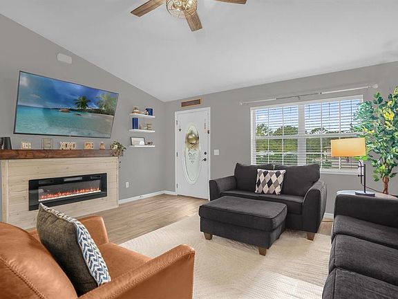 Seller offering major updates! The roof will be replaced prior to closing with an acceptable offer, and the flooring in the primary and second bedrooms will also be replaced. Nestled at the end of a quiet cul-de-sac, this well-maintained home sits on a generous 0.43-acre lot. Inside, you’ll find an open floor plan with fresh interior paint, updated lighting, and plank tile flooring throughout the main living areas. A custom-built fireplace with built-in shelving adds a cozy touch to the living space. The kitchen features newer stainless steel appliances, a prep island, wood cabinetry, a pantry, and a breakfast bar, perfect for both everyday living and entertaining. The primary suite includes a spacious walk-in closet and a full bath with a tub and shower combination. Additional highlights include a 20x20 attached 2-car garage, electric hookup for an RV on its own breaker, an open patio, and a large backyard ideal for relaxing, gardening, or adding future improvements. A mounted 65” LED Smart TV, along with all other TVs in the home, will remain for the new owners to enjoy. With no HOA, this property offers flexibility and convenience. Ideally located near Ocala and Belleview, it also provides easy access to Lake Weir’s dining and recreation.