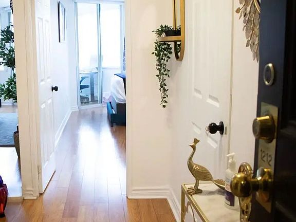 Welcome to this beautifully furnished one-bedroom plus den, one-bathroom condo, offering approximately 800 square feet of private, full-floor living space with stunning views of the Toronto skyline. This suite features rich hardwood flooring, central air conditioning, in-suite laundry, a spacious pantry, and a generous walk-in closet. Designed with modern professionals in mind, it includes a dedicated office den and an additional office nook, providing the perfect setup for remote work. Residents will also enjoy the rare luxury of a private hot tub. The unit is wheelchair accessible and no pets. Your monthly rental payment includes electricity with a $50 monthly cap, and a move-out cleaning fee of $295 applies. Perfectly located in one of Toronto's most vibrant neighborhoods, this home combines style, comfort, and convenience in an exceptional setting.