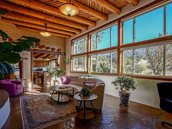 Classic New Mexican Hacienda! Character laden, one of a kind, architect designed 'wall of window' adobe on 4.25 private acres of unobstructed panoramic Sandia Mountain VIEWS plus large 1 bedroom guest casita w/ kitchen, dining, 2 mini-splits, studio and living room plus, a separate studio. Inviting great room features flagstone floors, vigas, latillas, wood burning Kiva, floor to ceiling windows with south view to the mountains. Since purchasing owners have made 200K of renovations including stucco, TPO roof with transferable warranty, new kitchen cabinets and appliances, 5 mini splits in main home, RO water system, irrigation system, rain catchment system perfect for gardening, gutters and re-graded. Checkout plethora of information attached online. Quick I-25 access to ABQ & Santa Fe.