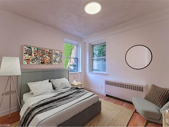 Welcome home to this clean, bright, and completely carpet-free one-bedroom, one-bathroom co-op apartment, featuring ample living space and an included storage locker. Nestled within the well-maintained Castle Apartments building and secure entry system, providing peace of mind for residents. Conveniently located in the heart of Hamilton’s popular Durand neighborhood, you're just steps away from St. Joseph's Hospital, the GO Station, public transit, restaurants, shops, and much more. The monthly co-op fee includes heat, water, property taxes, and exterior maintenance, offering truly effortless living. Important Note: Traditional mortgages are not available for this property. Buyers must arrange cash or private financing and secure approval from the Co-op Board.