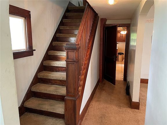 There's a formal entry plus a welcoming entry to the 10'x16' enclosed side porch where you'll want to spend your free time. You'll find spacious rooms, a good floorplan, wood floors under most of the carpeting, an abundance of kitchen cabinets and so much more to work with. Think of creating a 1st level laundry room in the 7'x15' half bath! There's an extra shower & commode in the basement, 100 amp electric service, central air, glass block windows, double insulated windows, rolled roofing on the side porch, a shed and a two-car detached garage. You can get creative with this hidden gem!