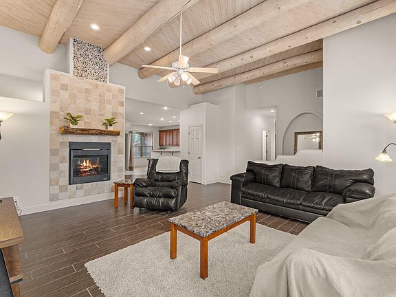Escape to the mountains w/ this beautiful Pueblo-style home in gated Ventana Del Sol! Sunlight pours through tall windows & skylights, illuminating the open floor plan w/ its stunning T&G ceiling, rustic vigas & 2-way gas fireplace. Modern updates w/in the past few years include new cabinets, countertops, vanities, flooring throughout, & a newer roof & water heater. The spacious living & dining areas flow seamlessly into the kitchen, offering abundant cabinet space, a reverse osmosis system & perfect balance of style & functionality. Step outside to a fenced dog run w/ convenient doggy door--perfect for furry friends! W/ HOA-managed wells, this move-in-ready home combines mountain tranquility w/ everyday ease, just minutes from I-40 & surrounded by natural beauty!
