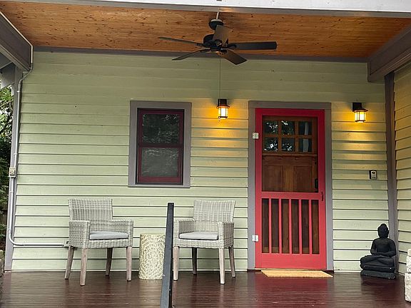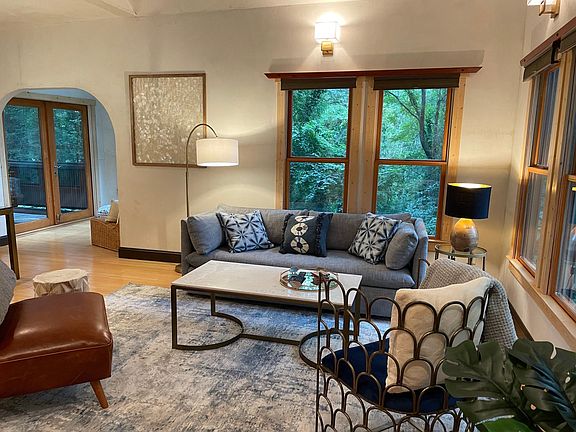This is a furnished property, and rent includes utilities. Located within walking distance to downtown on an incredibly private and wooded lot, this luxurious and stylishly appointed three-bedroom getaway will exceed your expectations. Nestled in a historic neighborhood, this furnished home features an open, modern interior space that blends comfort and sophistication. The house has its own driveway and ample off-street parking. This sunny home brings the outdoors in with a fabulous screened porch & sunroom viewing the treed canopy. The gourmet kitchen boasts cherry custom cabinets & z-brushed granite, along with stainless steel appliances, including a 6-burner gas cooktop. The main floor, featuring the primary bedroom, is spacious, complete with a king bed, an attached bathroom, and a small sitting porch overlooking the backyard. The second-floor bedroom has an attached bathroom with a queen bed. The third-floor bedroom has two double beds and a lovely sunset view. The home features a dedicated office, as well as ample closet space. This very special home offers a secluded oasis, but it's just 5 minutes from downtown Asheville's fun.
